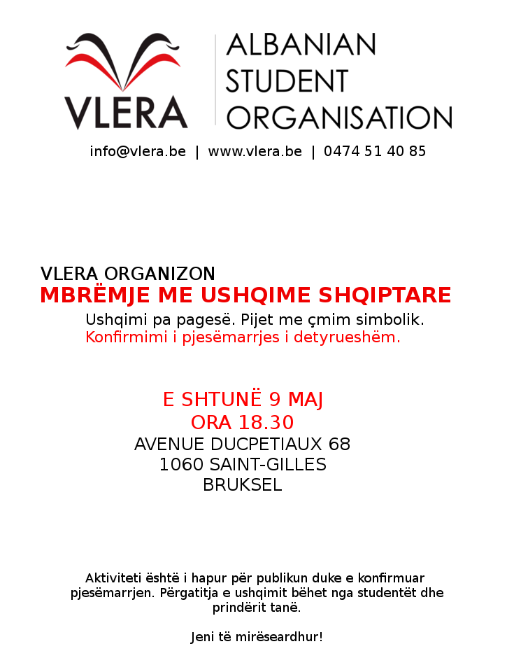Të shtunën me datën 9 maj, VLERA organizon mbrëmje me ushqime shqiptare. Sikurse vitin e kaluar edhe këtë vit do të organizojmë mbrëmjen me ushqime tradicionale.
