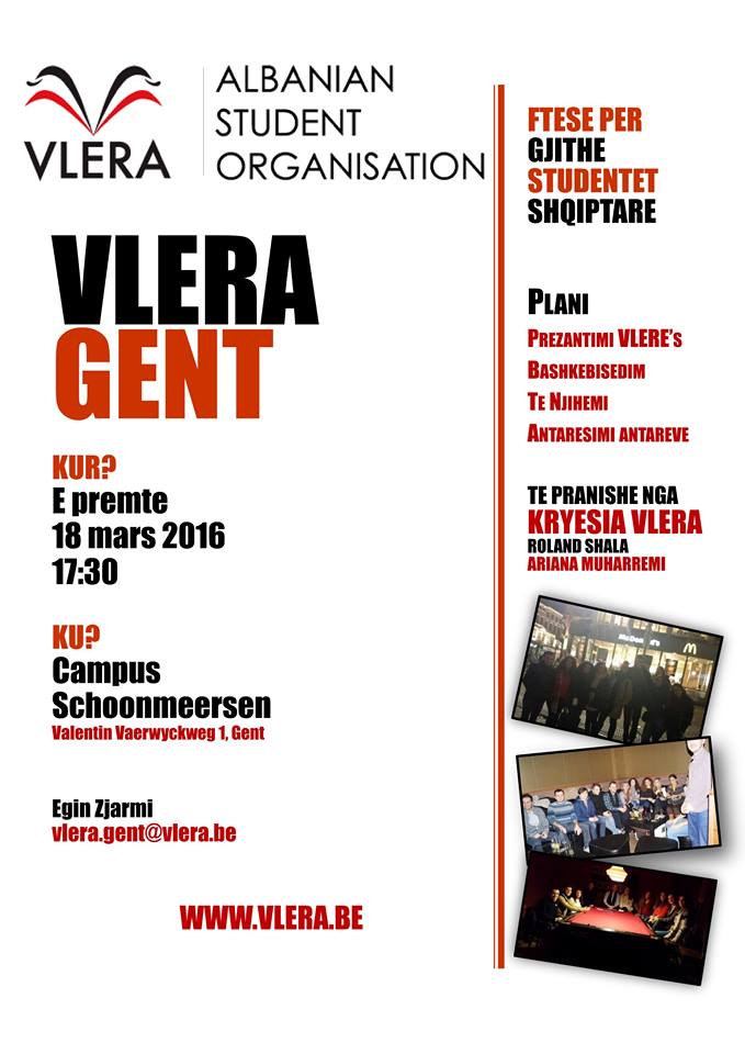 VLERA (Albanian students organization) që në 2011 mundohet që të bashkoj studentët shqiptarë në Belgjikë. Besoj që secili prej nesh është i interesuar të shoqërohet e të ndaj përvojën e tyre me studentët tjerë shqiptarë, pse jo dhe të ndihmojmë njëri-tjetrin.